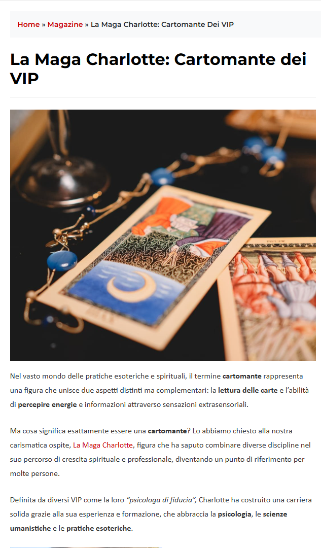 Leggi l'intervista esclusiva che racconta la carriera di La Maga Charlotte come cartomante dei VIP.